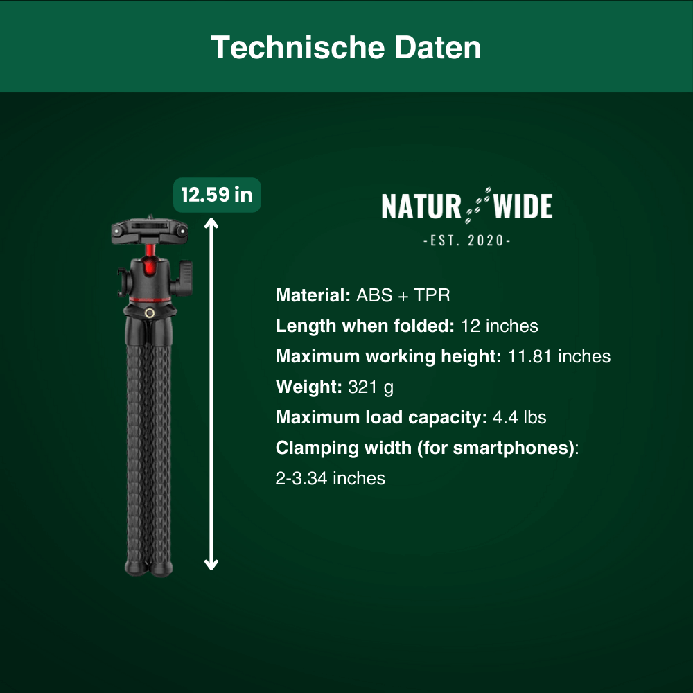 Whether for vlogs, nature photography, or creative perspectives – the Pro Tripod gives you total freedom while shooting. Its flexible legs can be secured on almost any surface, while the 360° ball head ensures the perfect angle every time. Thanks to the 2-in-1 design, you can mount not only cameras and smartphones but also accessories like microphones or LED lights.