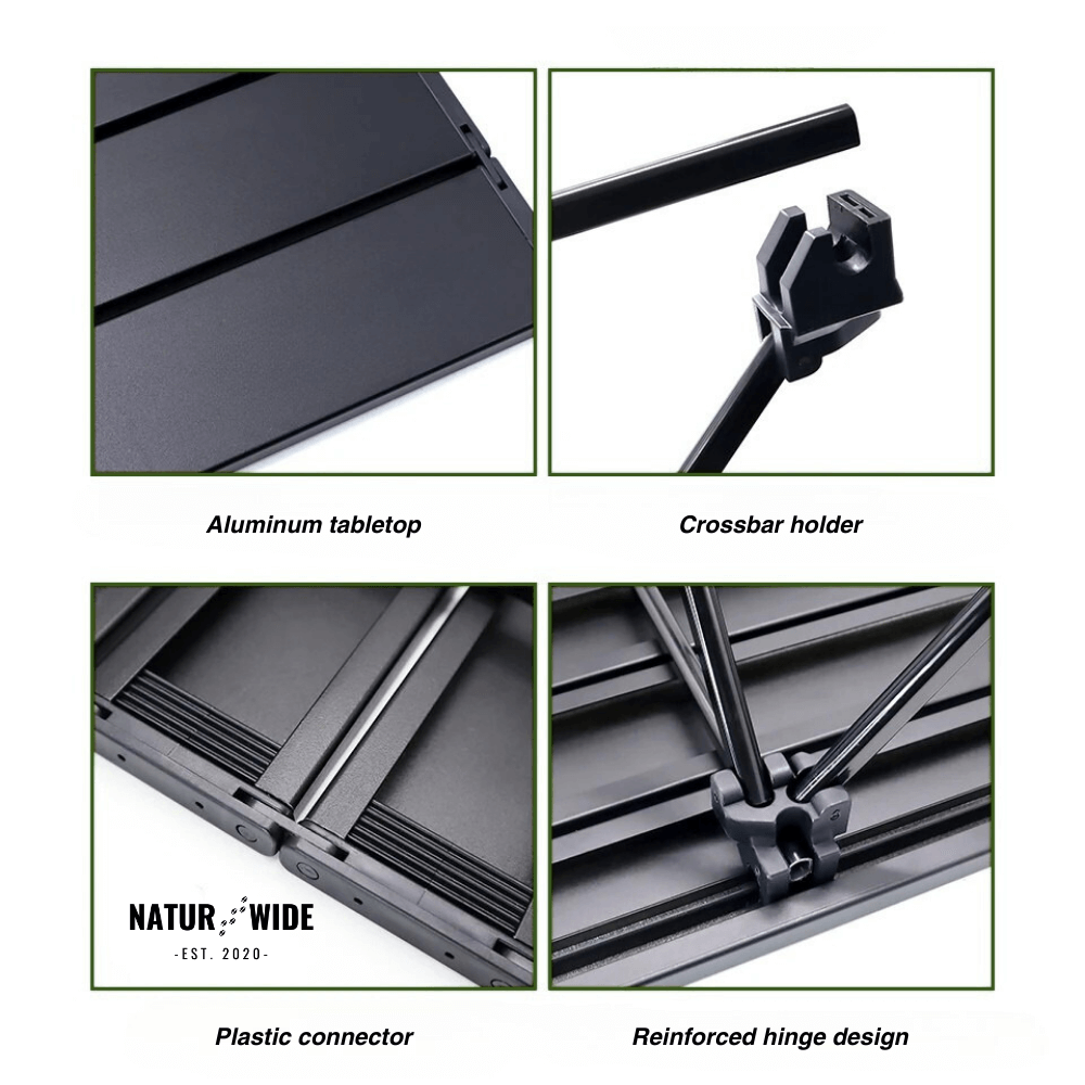 Made from high-quality aluminum alloy, the table withstands heavy loads – ideal for food, drinks & camping equipment.