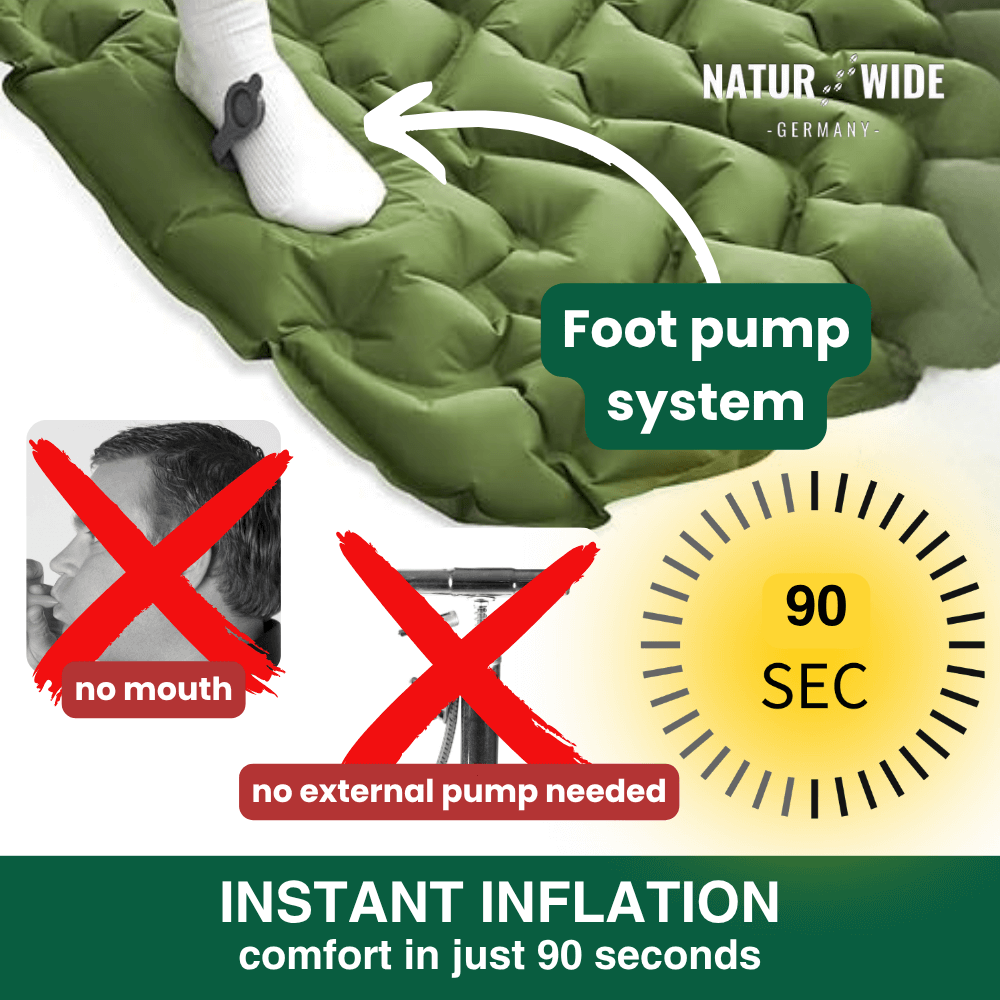 Thanks to the integrated foot pump , the sleeping pad is ready in just 30–60 seconds – no more tiring mouth inflation or bulky external pumps.