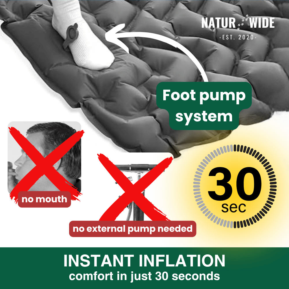 Thanks to the integrated foot pump , the pad is fully inflated in just 30–60 seconds – no need for tiring mouth inflation or bulky external pumps.